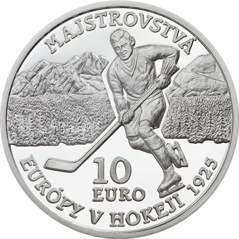 Stříbrná 10 EUR mince vydaná ke 100. výročí pořádání Mistrovství Evropy v hokeji.