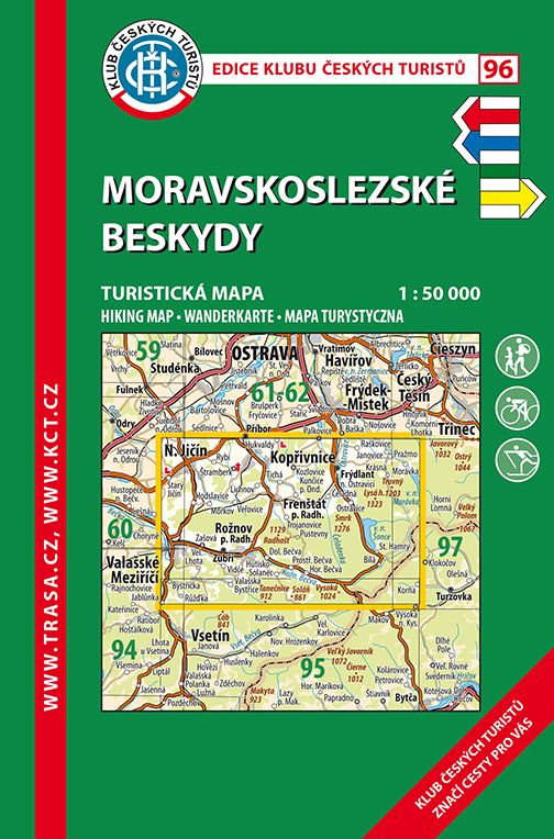 Mapa č. 96 Moravskoslezské Beskydy. Divokou přírodu Moravskoslezských Beskyd, zastoupenou pestrou mozaikou luk, pastvin, remízků a rozsáhlých lesních porostů, zdobí valašská a goralská stavení.