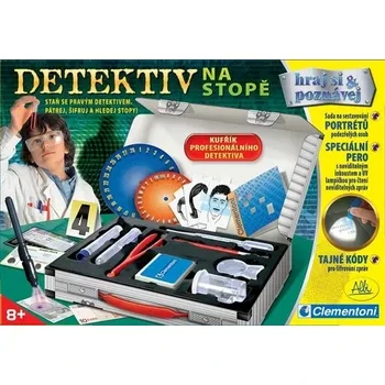 Experimentální sada Detektiv na stopě. S kufříkem profesionálního detektiva se dozvíš spoustu informací o detektivních technikách. Balení obsahuje sadu na sestavování portrétů podezřelých osob, sadu na snímání otisků prstů a speciální pero s neviditelným inkoustem.