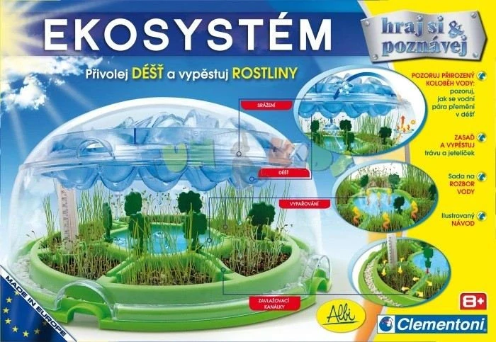 základna ekosystému (průměr 27 cm), části zavlažovacích kanálků (ve tvaru stromu), průhledná kruhová stěna (výška 11 cm), disk s mraky, malé mráčky, průhledné zavírací víko, teploměr, semínka v sáčku, štěrk, rašelina, 100 ml nádobka s víčkem, plastová nádobka, pipety, velká lopatka, papírky na rozbor vody, brčko a podrobný návod v českém a slovenském jazyce.